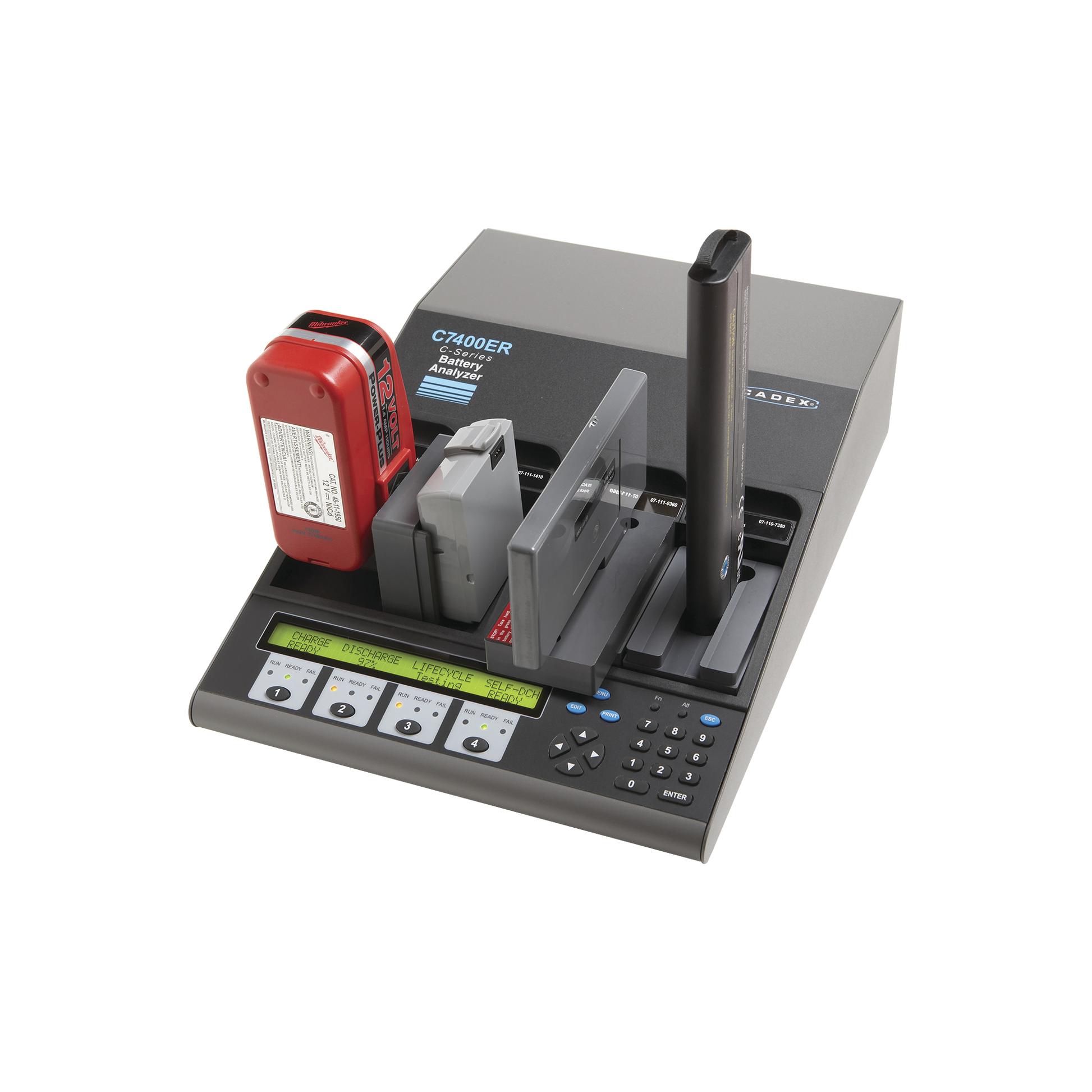 Los analizadores de baterías de la serie Cadex C7000 sirven a baterías de litio, níquel y ácido de plomo en el mismo dispositivo con un simple cambio de adaptador. Simplemente deslice la batería en uno de los 3.200 adaptadores de batería personalizados o elija uno de los 4 adaptadores universales y descubra por qué los analizadores de baterías de la serie C7000 se han convertido en los principales analizadores de batería del mundo.