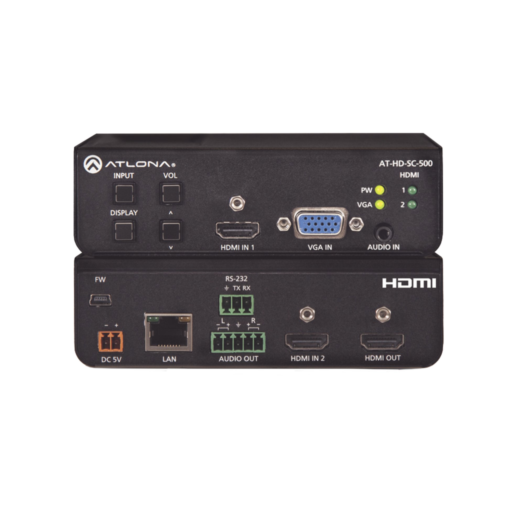 El Atlona AT-HD-SC-500 es un conmutador y escalador HD 3×1 con dos entradas HDMI y una entrada VGA con audio. Está diseñado para tomar señales de vídeo de conmutadores, PC o portátiles y escalarlas a una salida HDMI en una amplia gama de resoluciones y velocidades, hasta 1080p a 60 Hz y 1920×1200. El HD-SC-500 puede servir como componente central de un sistema AV compacto y automatizado con la comodidad de la selección automática de entrada y el control de pantalla. Permite la selección de entrada, el volumen y el control de encendido/apagado de la pantalla desde el panel frontal o comandos externos RS-232 o TCP/IP. El HD-SC-500 incorpora muchas características de conveniencia de integración populares y, al mismo tiempo, ofrece un valor excelente para aulas, salas de reunión pequeñas y espacios para reuniones.