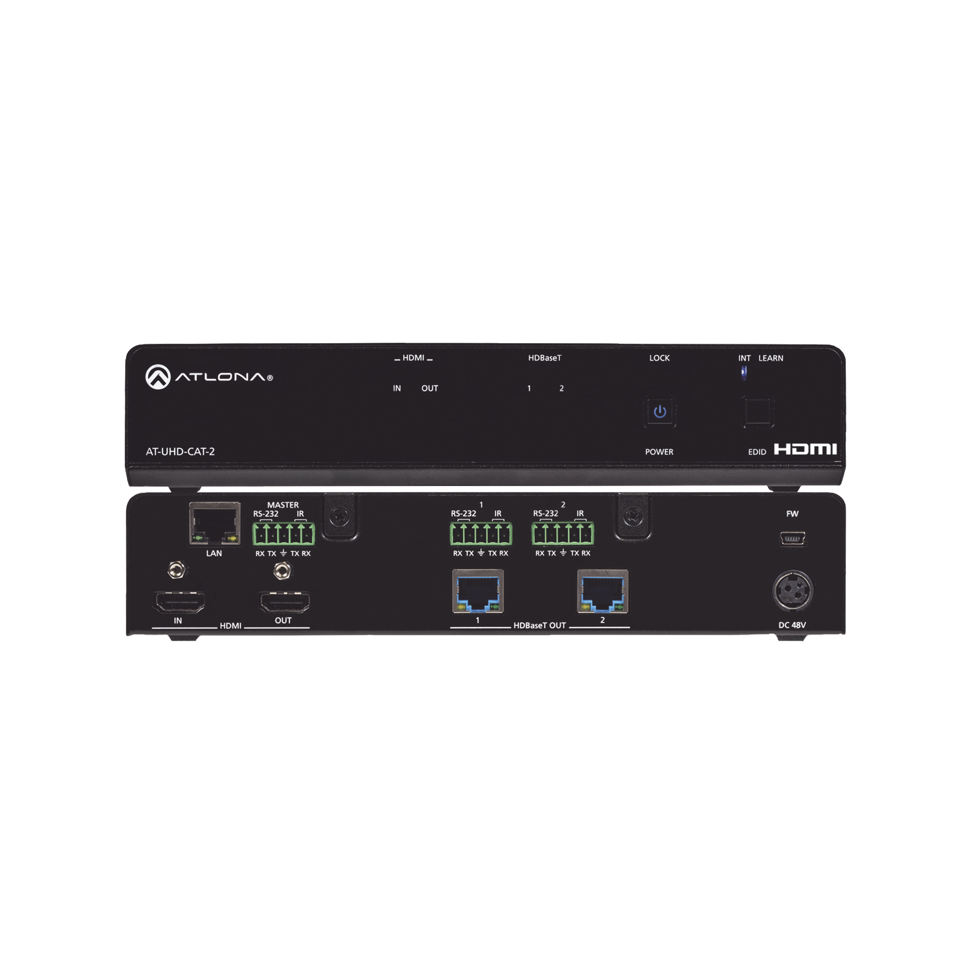 El Atlona AT-UHD-CAT-2 es un amplificador de distribución 4K/UHD HDMI a HDBaseT que cuenta con conexiones de entrada HDMI de paso, dos salidas HDBaseT y capacidad de control de pantalla. Cada salida transmite señales AV y de control de hasta 70 m (230 pies) a 1080p y 40 m (130 pies) a 4K/UHD. Las características incluyen 4K/UHD @ 60 Hz con submuestreo de color 4:2:0, cumplimiento de HDCP 2.2, administración EDID y PoE para alimentar receptores remotos. El UHD-CAT-2 puede controlar una amplia variedad de pantallas de consumo mediante CEC*. Diseñado para aplicaciones de distribución comercial, el UHD-CAT-2 es compatible con el sistema de control y se integra con cualquier sistema de control TCP/IP, RS-232 o IR y cuenta con un gabinete de 1U de ancho de medio rack con fuente de alimentación externa internacional. Receptor Atlona compatible: AT-UHD-EX-70C-RX.
