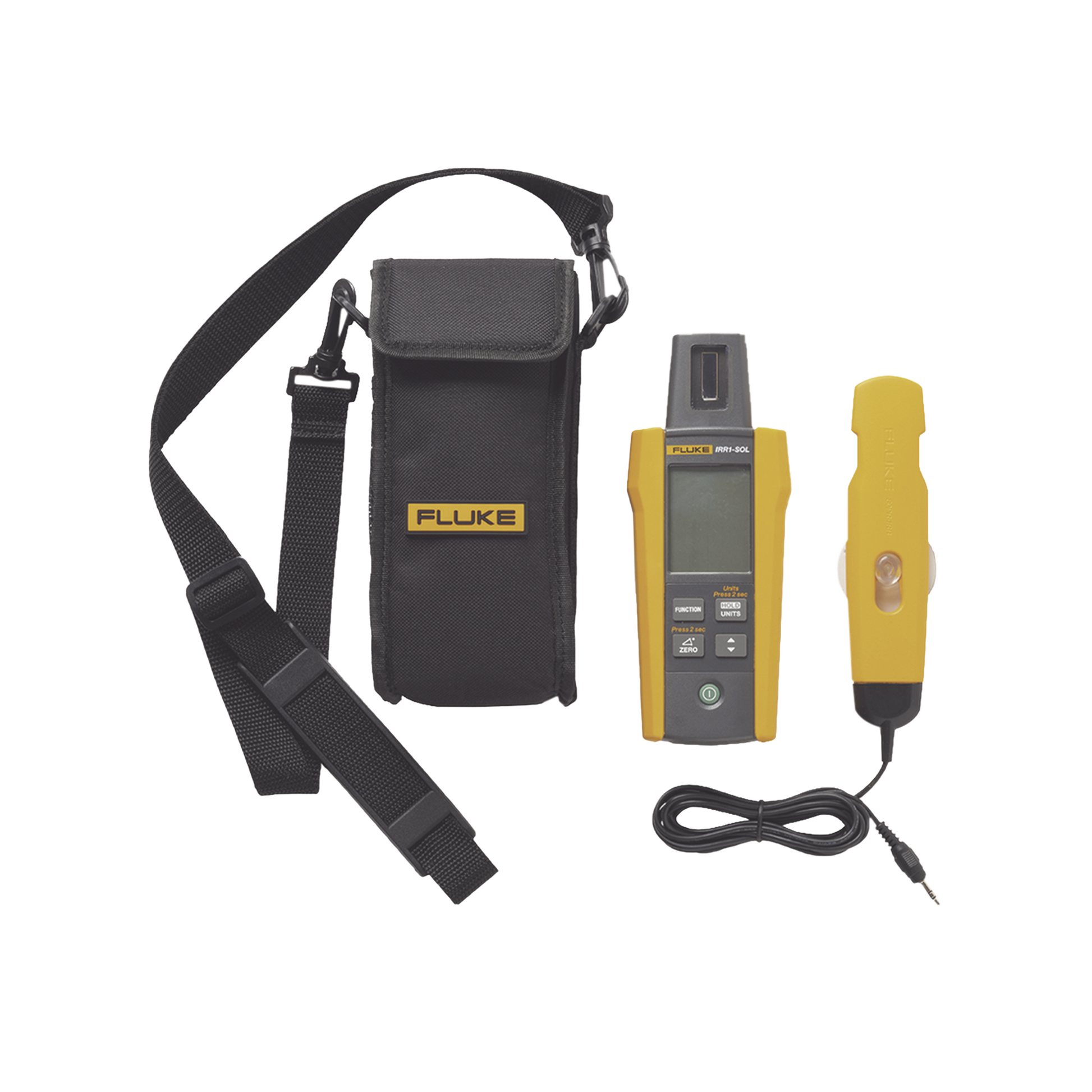 - Incluye : Medidor de radiación solar FLK-IRR1-SOL, sonda externa de temperatura FLK-80PR-IRR con ventosa, maletín de transporte C250 con correa para el hombro, (4) pilas alcalinas AA, manual de usuario.