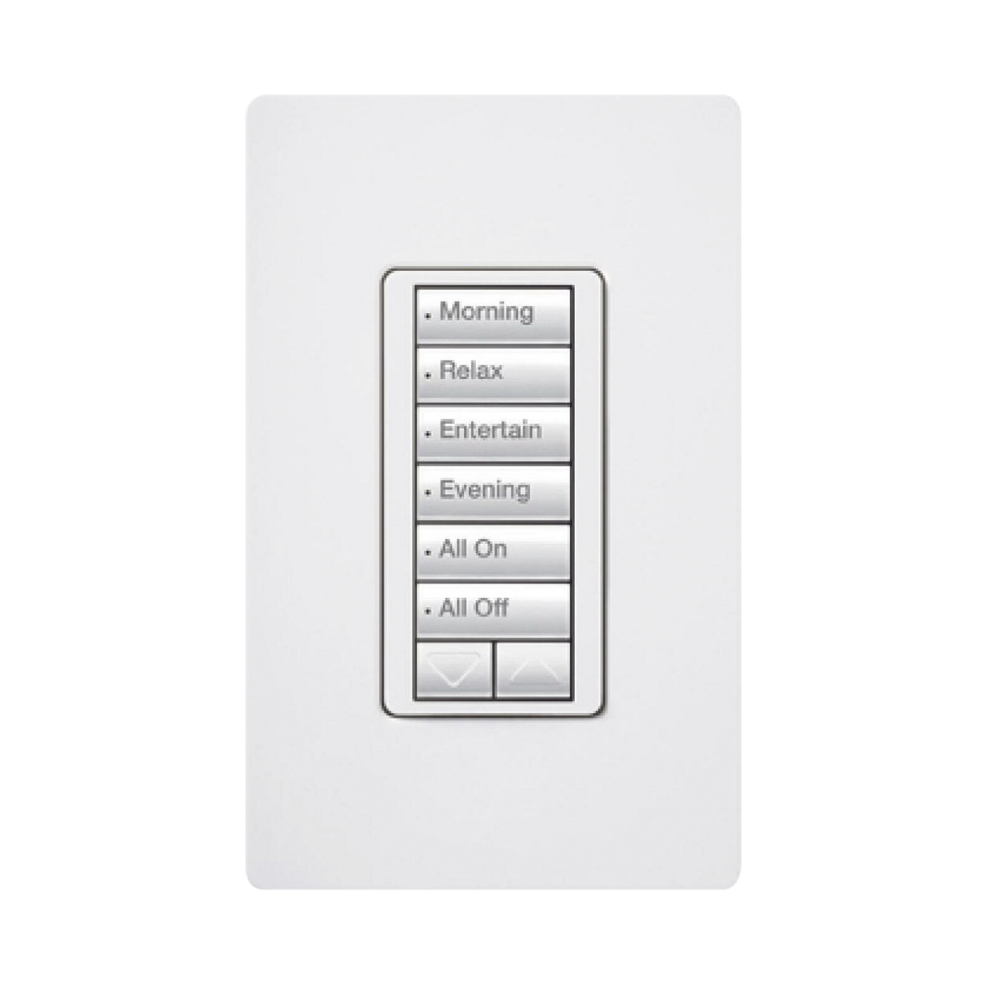 La botonera híbrida montada en la pared se instala en lugar de un interruptor de luz estándar para ofrecer atenuación de la iluminación a la que está conectada, además de los beneficios del sistema de una botonera montada en la pared. Los botones de la botonera pueden programarse para que controlen cualquier otro dispositivo de control de iluminación, además de las cortinas.