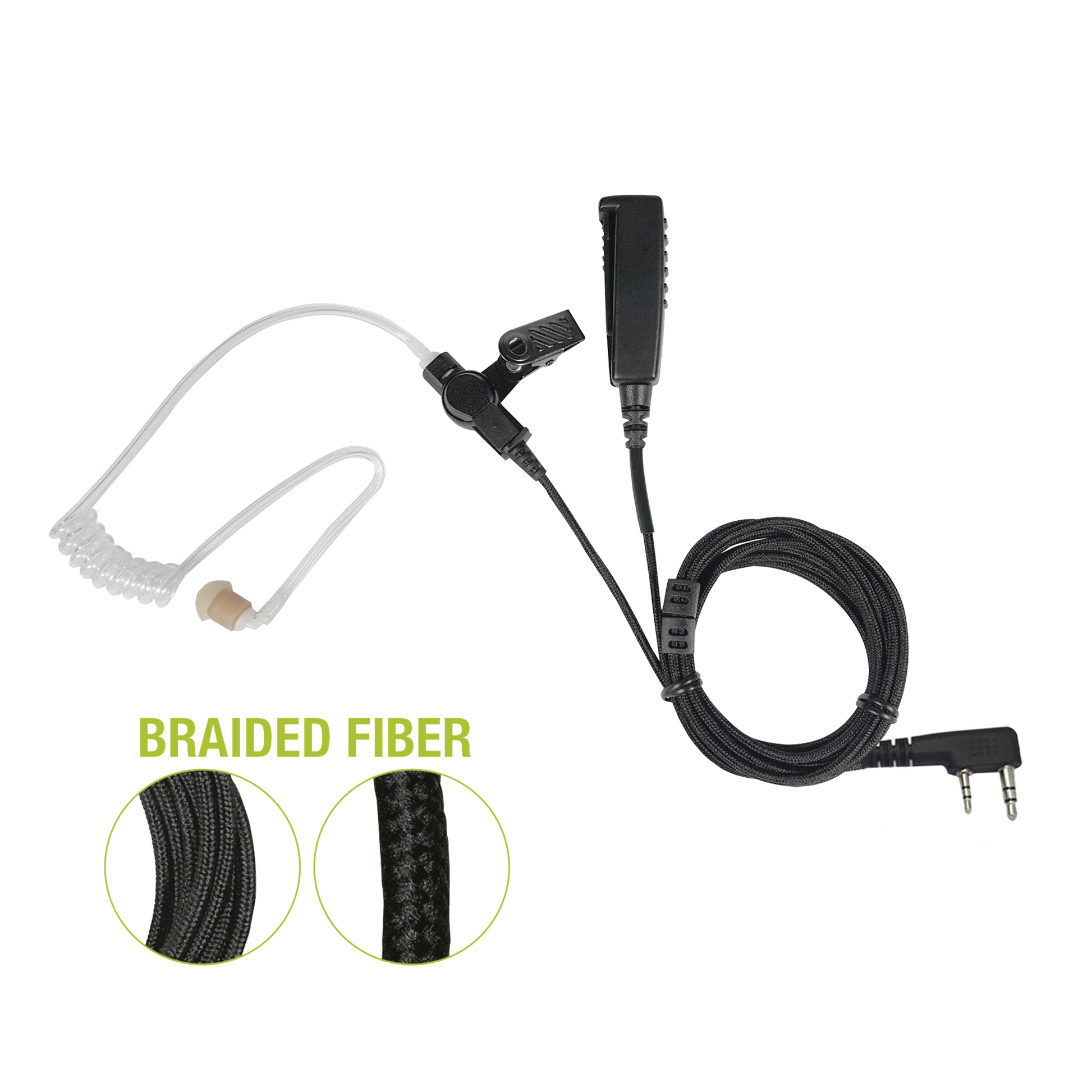 El cable de fibra trenzada hecho a la medida es suave, cómodo y resistente al enredo Montaje de tubo acústico TWIST CONNECT (de 1/4 de vuelta) para la higiene de múltiples usuarios y facil instalación en campo. Este es un auricular de vigilancia de 2 cables con tubo acústico es extremadamente robusto de 2 cables (para un solo cable, tenga en cuenta la serie SPM-1300) La carcasa de micrófono recientemente diseñada utiliza una capacidad de transmisión de alta calidad El clip reforzado para el micrófono audífono proporciona una excelente retención del cable y elimina la tensión en los auriculares El clip del PTT encubierto se une a la solapa, capa, manga, según lo requiera el usuario.