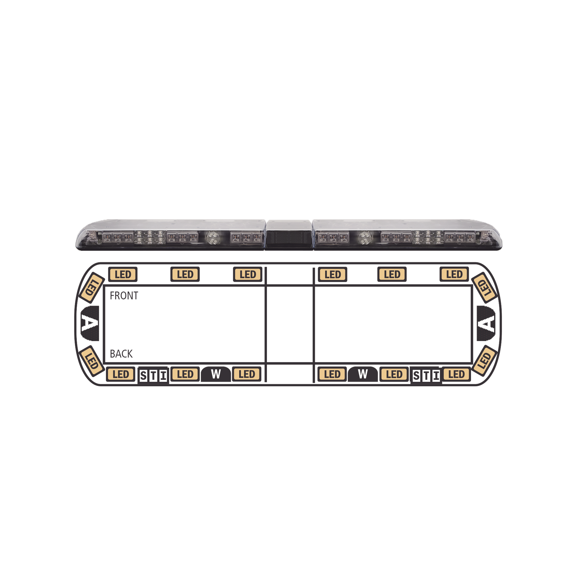Configuración: 16 módulos con 3 leds c/u en color Ámbar, 2 luces de trabajo con 3 leds c/u en cólor claro, 2 módulos traseros de alto, reversa y direccionales con 3 leds c/u en color rojo, blanco y ambar, director de tráfico.