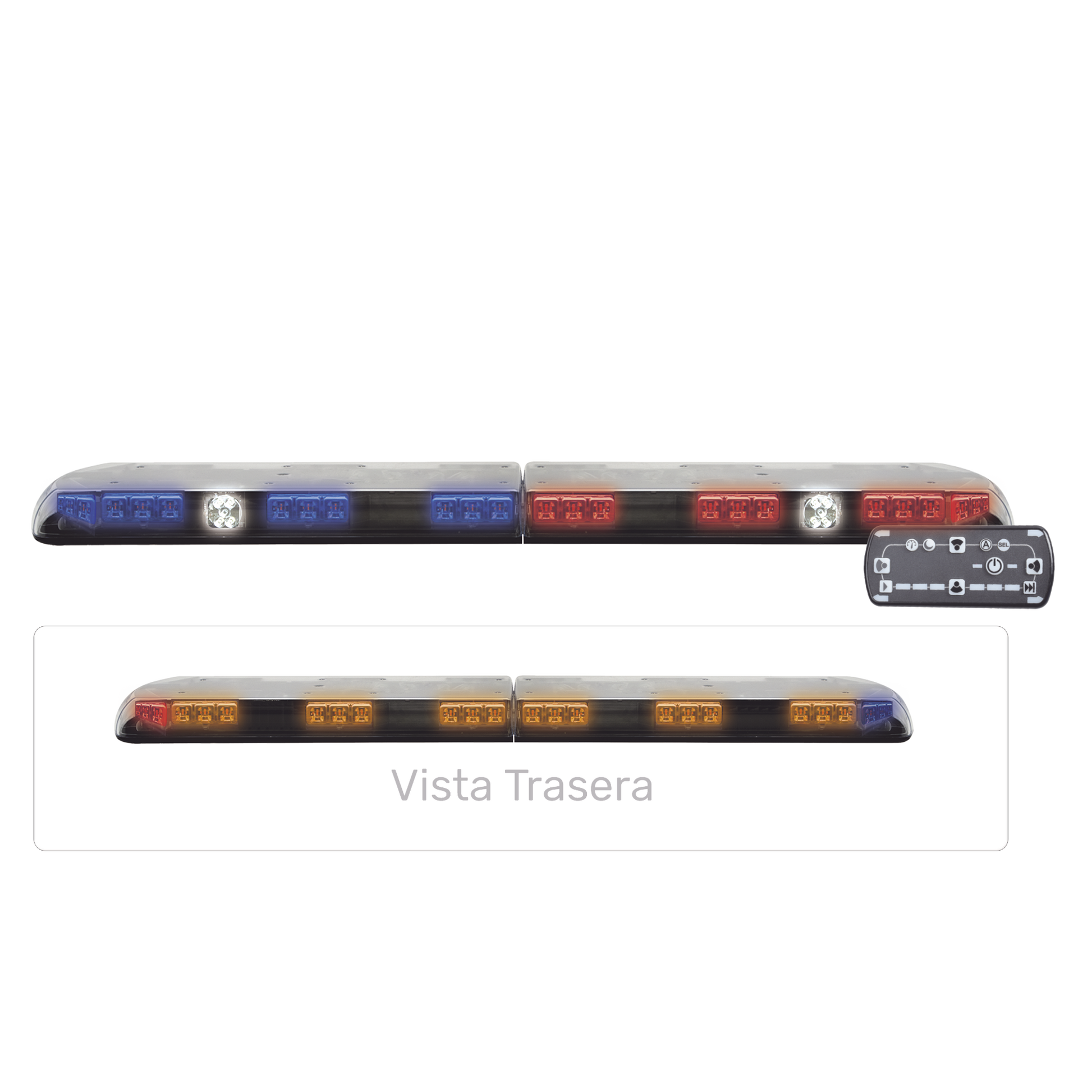 Configuración: 3 módulos frontales con 3 leds c/u en color Rojo, 3 módulos frontales con 3 leds c/u en color Azul, 6 módulos traseros con 3 leds c/u en color Ámbar, 2 módulos esquineros con 3 leds c/u en cólor Rojo, 2 módulos esquineros con 3 leds c/u en cólor Azul, 2 módulos frontales con 4 leds c/u en color blanco como luz de penetración y 2 módulos laterales con 4 leds c/u en color blanco como luz callejonera.