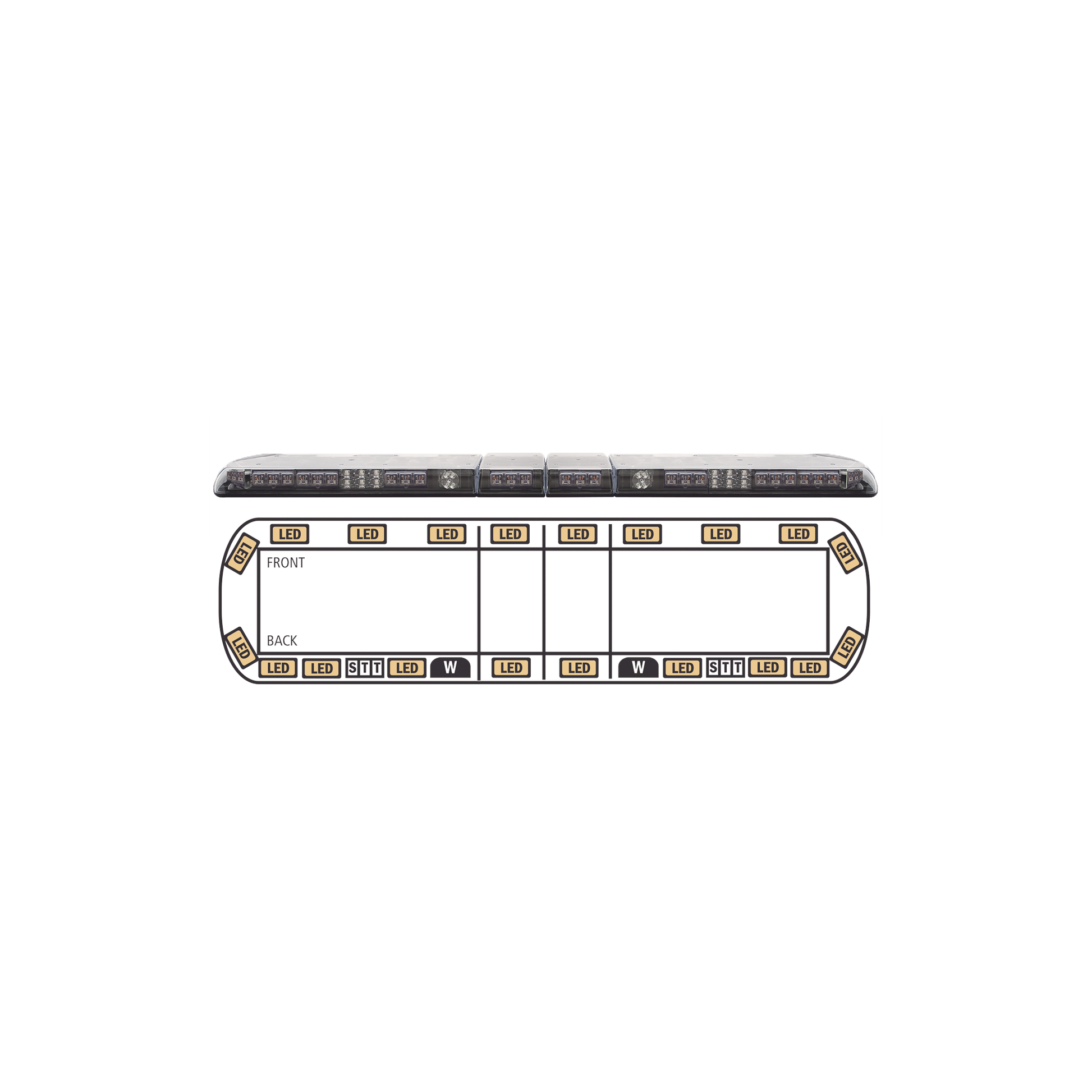 Configuración: 20 módulos con 3 leds c/u en color Ámbar, 2 luces de trabajo con 3 leds c/u en cólor claro, 2 módulos traseros de alto, reversa y direccionales con 3 leds c/u en color rojo, blanco y ambar, director de tráfico.